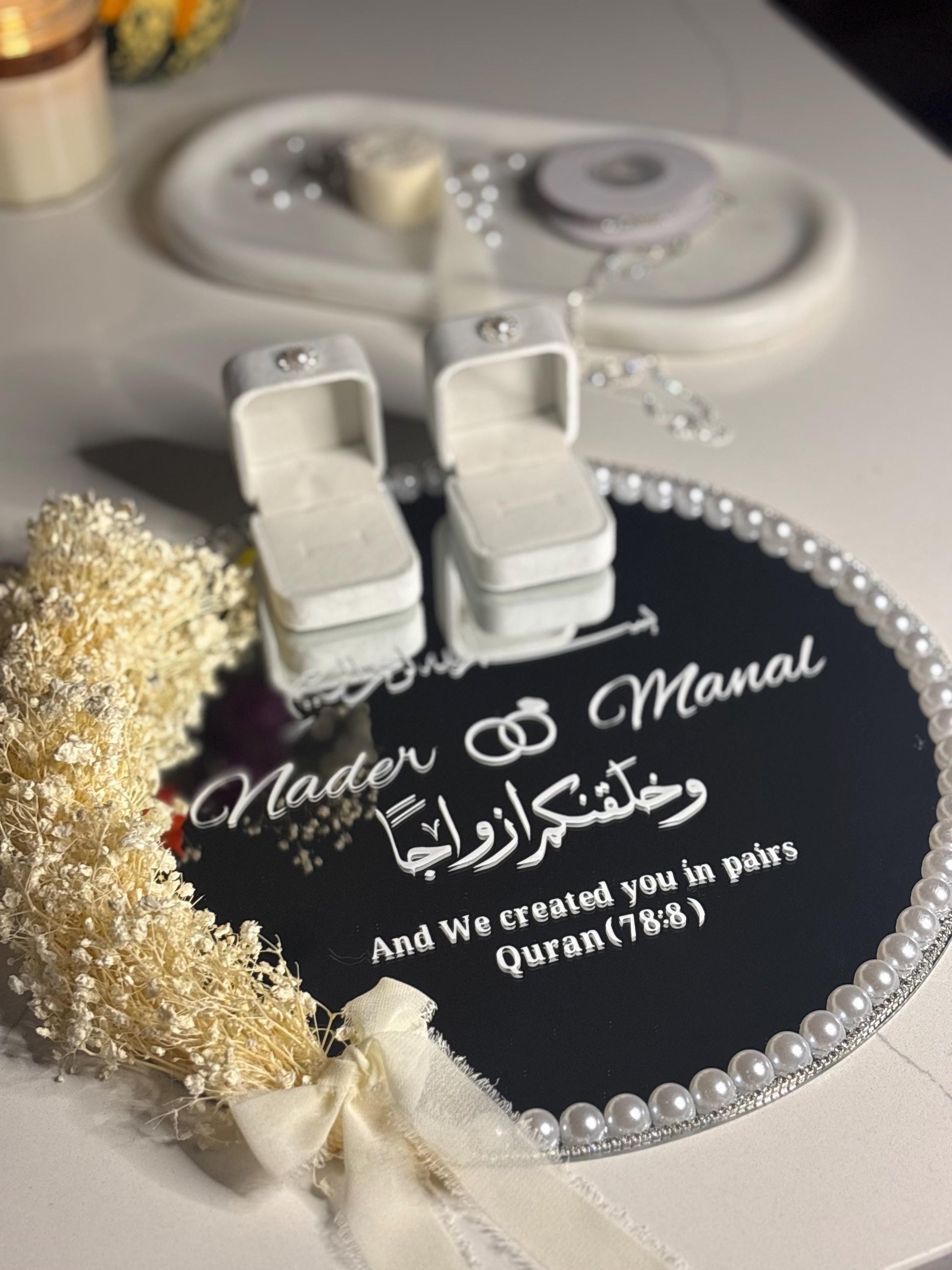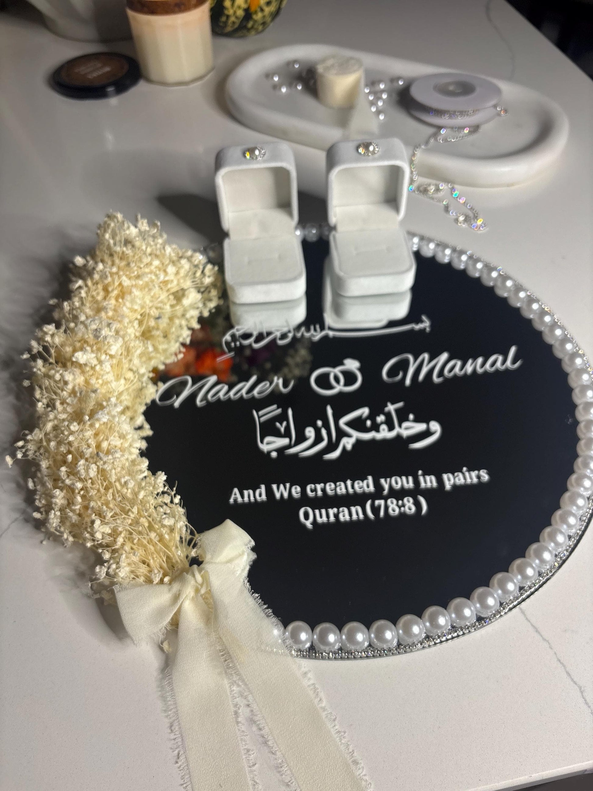 Make your engagement or nikkah ceremony even more memorable with this beautiful personalized Islamic engagement tray. Crafted on a high-quality mirrored base, this round tray is delicately adorned with pearl and rhinestone beading along the edge and accented with elegant dried babybreath floral. Round mirror acrylic base (size: approx. 12 inches)