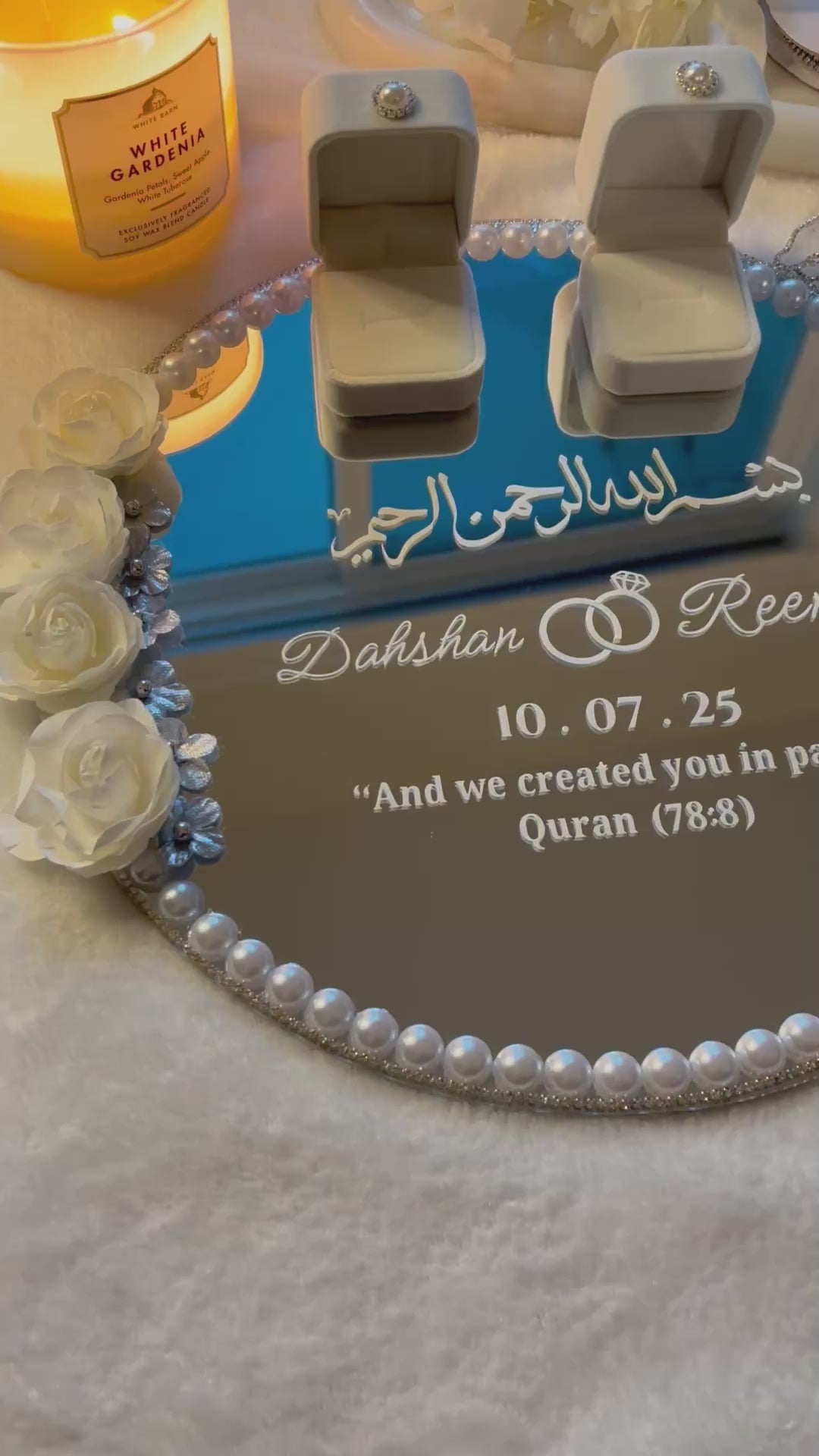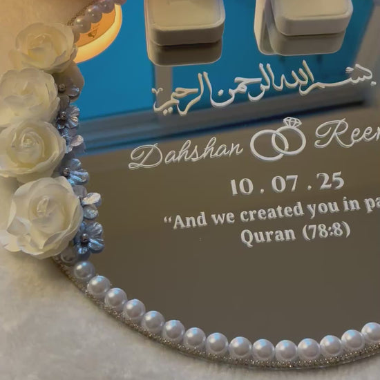 Make your engagement or nikkah ceremony even more memorable with this beautiful personalized Islamic engagement tray. Crafted on a high-quality mirrored base, this round tray is delicately adorned with pearl and rhinestone beading along the edge. Features: Personalized with couple’s initials or names. Includes Arabic calligraphy: Bismillah ir-Rahman ir-Rahim • Finished with premium faux pearls, rhinestones, and silver handles. Round mirror base (size: approx 12 inches)