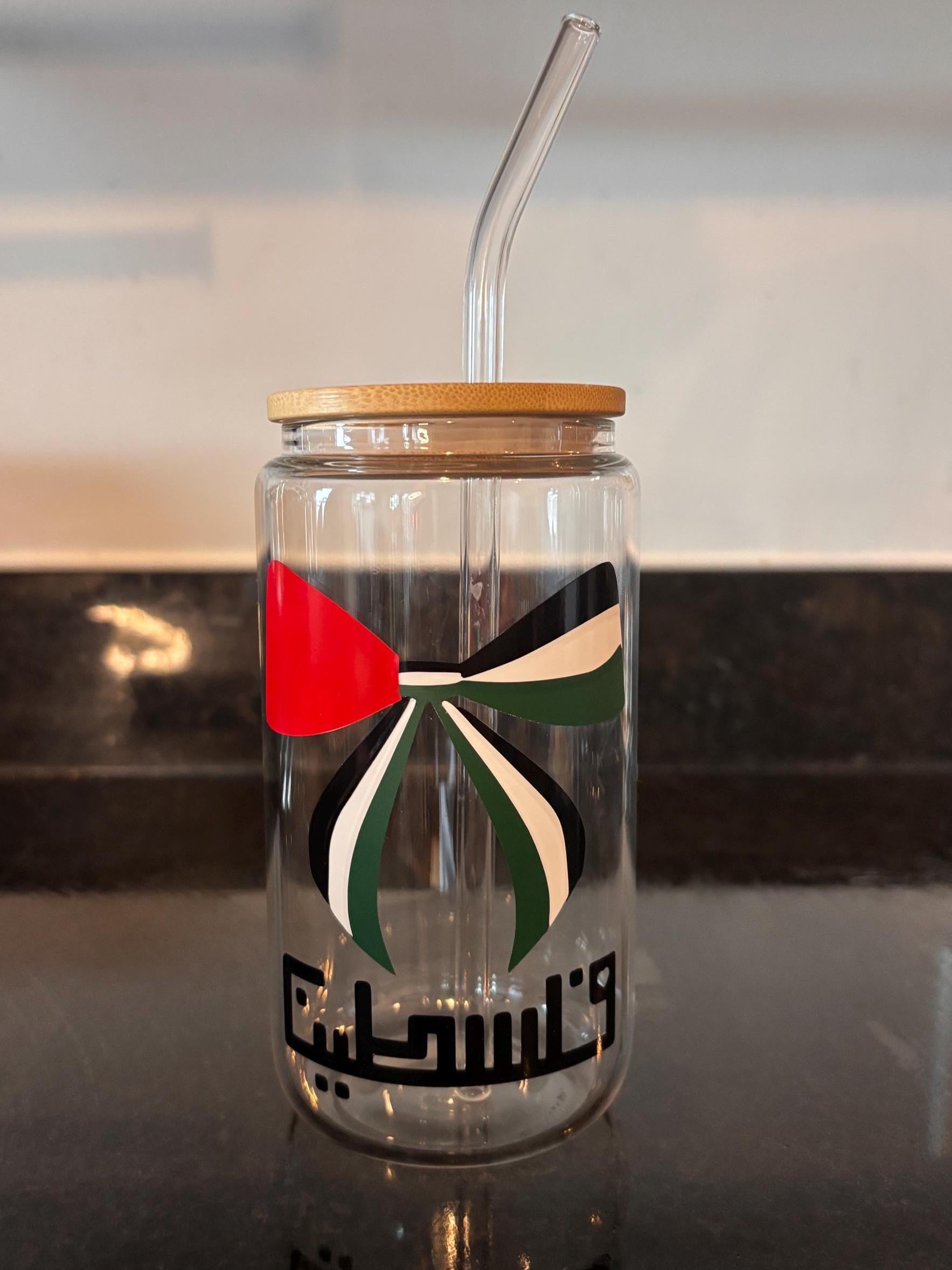 Show your pride with this beautiful 16 oz glass can tumbler featuring a vibrant Palestinian flag-inspired bow design and Arabic calligraphy that reads “فلسطين” (Palestine). Perfect for iced coffee, tea, or any cold beverage, this cup comes with a bamboo lid and reusable glass straw—eco-friendly and stylish.